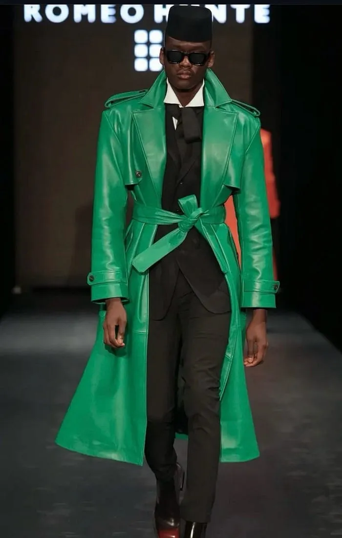 Later that evening, Romeo Hunte himself wore the black leather cape to the afterparty, extending the life of the runway piece beyond the show and into the celebration that followed.